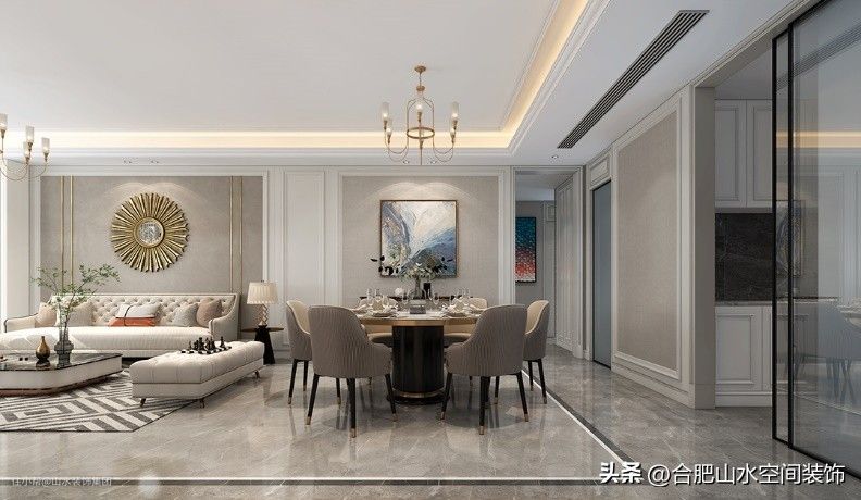 与之相对的沙发背景墙,则选择了在护墙板的基础上,加入墙纸装饰,增添金属线条提升空间质感。墙面主体部分利用美式风格中常见的太阳镜壁挂填充,圆形的金属图案与镜面相得益彰,平添一份精致和时尚。