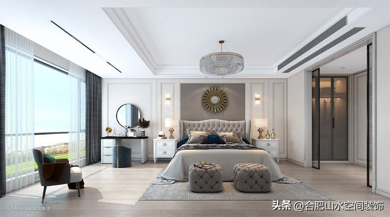 为保护居者生活的私密性,营造出更加安静舒适的睡眠环境,主卧设置在二楼,并配套有独卫、衣帽间等空间。为了扩容,并增加室内采光,我们将阳台纳入卧室中,满足了屋主对全景式落地窗的憧憬,也为放置梳妆台提供了方便,空间宽敞更好住,够大气!