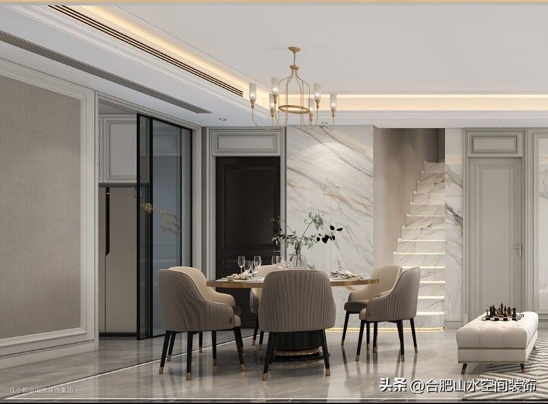 墙面、顶面、地面均与客厅保持一致,让视线在空间内得以延伸,空间整体感得以增强。护墙板与大理石、金属的搭配,则将简美风的轻奢诠释的淋漓尽致。圆形的岩板餐桌增加金属镶边,松软的皮椅围合出一家人用餐的温馨场域。杯盏之间,是美味佳肴,也是阖家团圆的欢愉与幸福。
