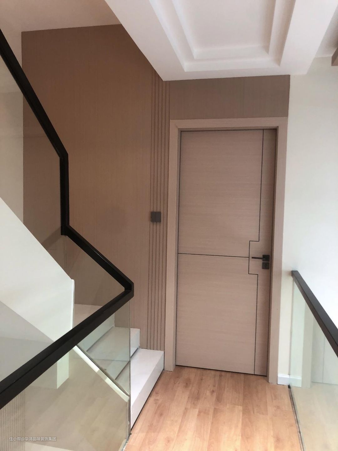 二楼过道地板的选择了原木地板,墙面与门则选择了浅棕色的面板,再搭配上白色楼梯台阶,敞亮好看。