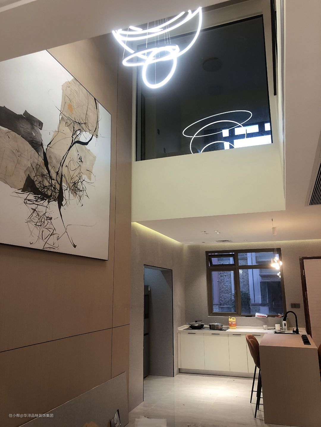 设计师利用一二层楼的层高做了一个挑高的设计,墙面和天花用浅咖色的护墙板进行装饰,一盏圆环立体大吊灯将空间点亮,非常的气派。