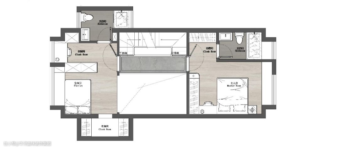 因为一楼餐厅区域做了一个挑高的吊顶设计,所以经楼梯上二楼之后空间呈左右分布,左边做了一个大套房的设计,包括衣帽间、梳妆间和卫生间,同时还将阳台进行了改造,设计成了一个独立的衣帽间,非常实用。右侧则为主卧,宽敞的空间,简洁实用的布局,非常舒适。