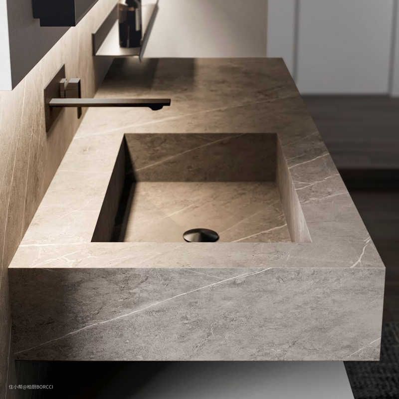 瓷砖的渗水率最低为千分之三,而岩板渗水率为万分之二,可放心的应用到卫浴空间,重点是还好看,一体感很强。