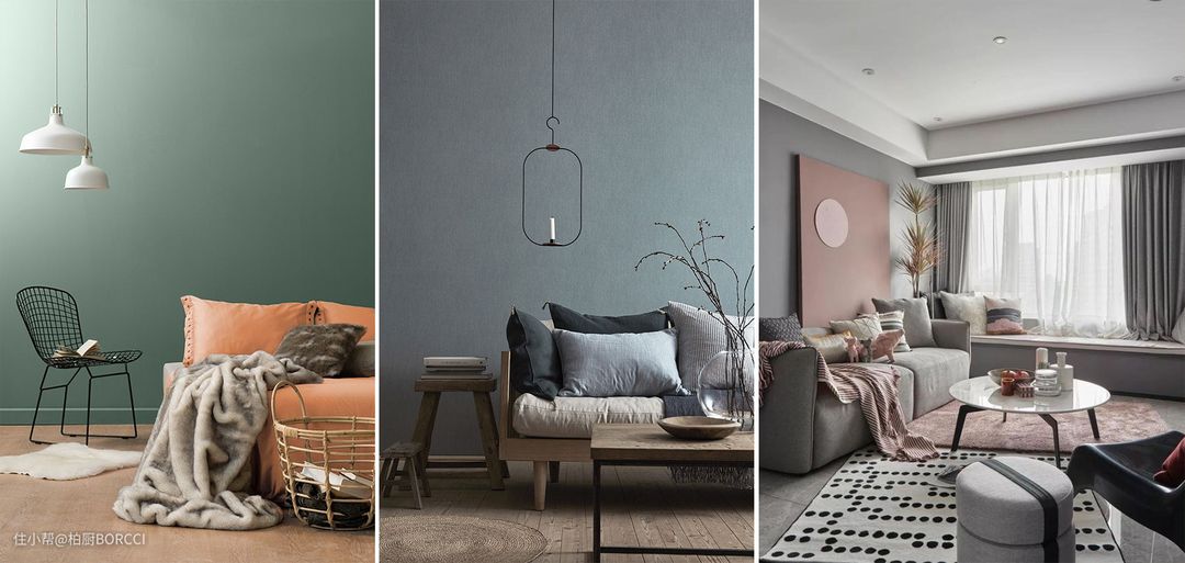 低饱和度的莫兰迪色如同被蒙上了一层灰一样,不张扬,不夺目。大面积地铺陈于家居空间,看起来相当平和与优雅,常见可用于墙漆或者墙纸。