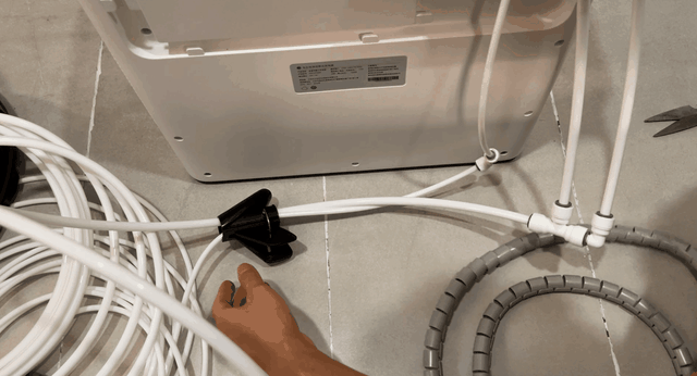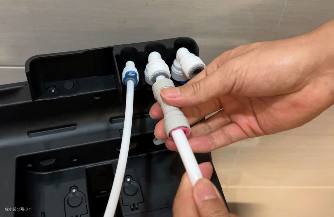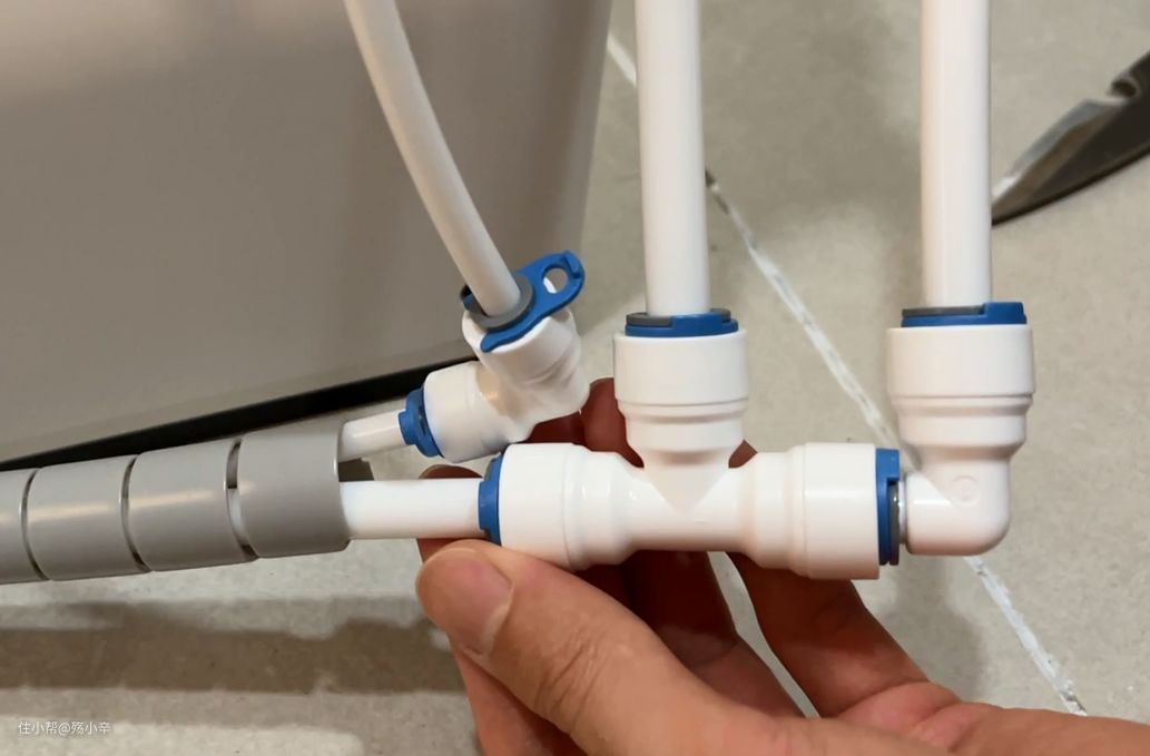 安装好后清水三通阀并接好进水管的样子(插入二分管到清水三通阀的时候记得拔掉锁片,接入完毕再把锁片插回去)