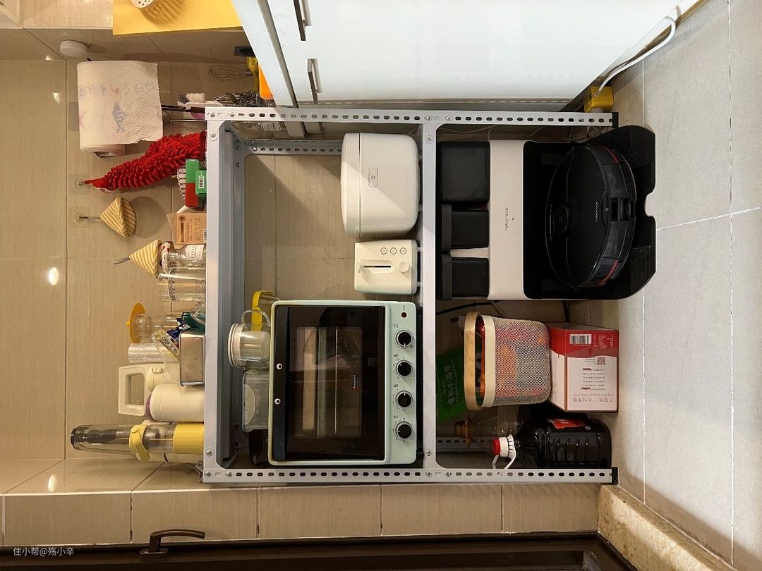 我是专门买了一个货架,这样底部就能放扫地机器人和厨房物品,其他层还能放电饭煲、烤箱以及其他厨房杂物~