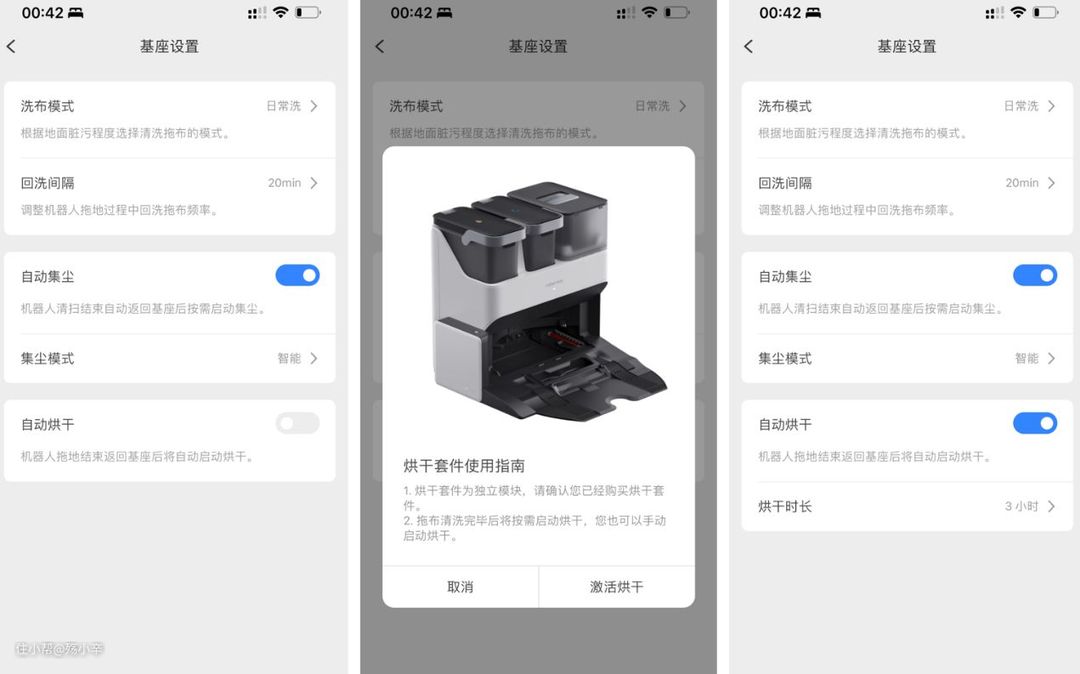 在米家app或者石头的「Roborock」app—扫地机器人--「基座设置」--打开「自动烘干」就可以设置烘干的的时长、开关等参数了~