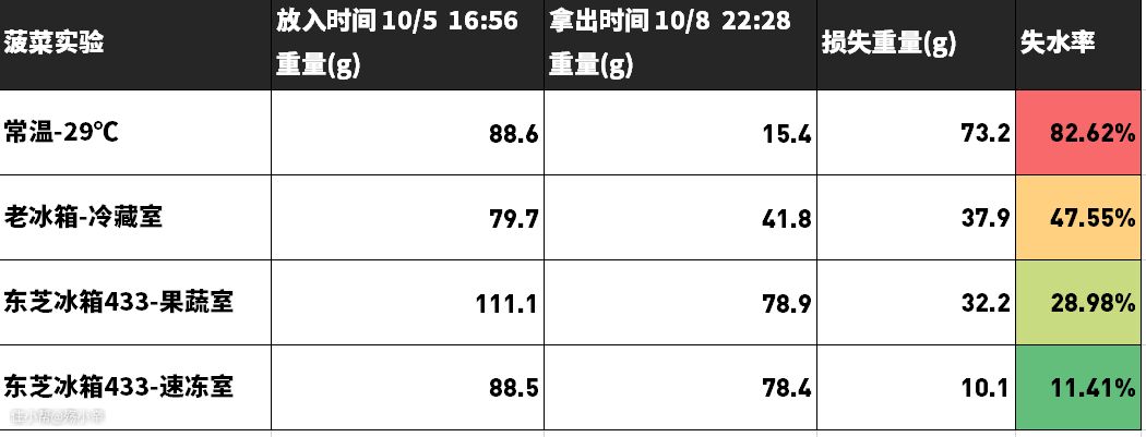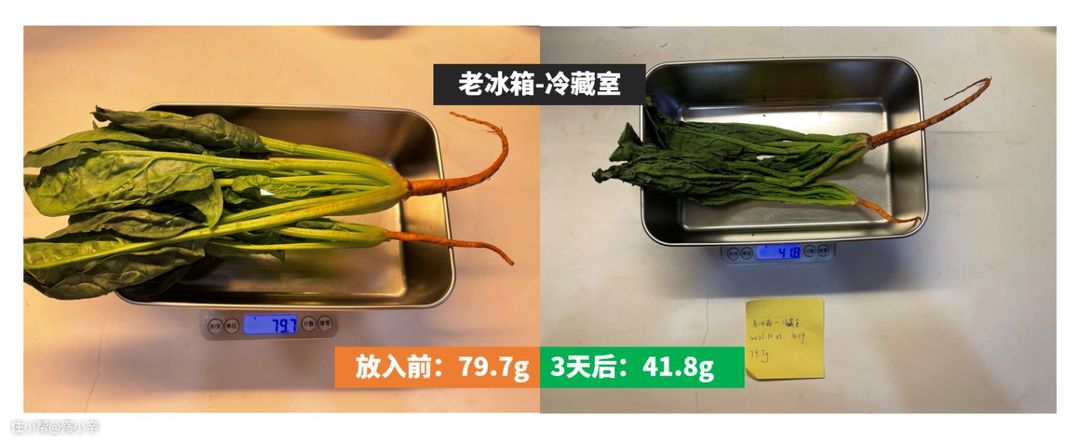 我尝试做了个对比,按照国标用菠菜进行测试,称重后分别放置在常温(深圳29-32℃)、老冰箱-冷藏室、东芝冰箱433-果蔬室和速冻室。3天后再拿出来称重,看看失水率如何。