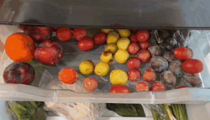 小芝把果蔬室上层铺满了水果,说每次打开冰箱拿水果像在果园采摘水果一样。
