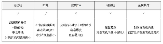 皮制品、厚重鞋底、带有金属装饰的不建议用洗衣机洗(会损伤洗衣机内壁),面料比较贵重的也不建议。