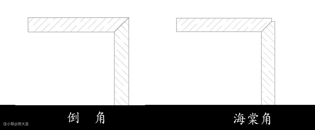 建议做海棠角,在切割45度切割时,预留2毫米的阳角,切割完后就会有这样一条槽,