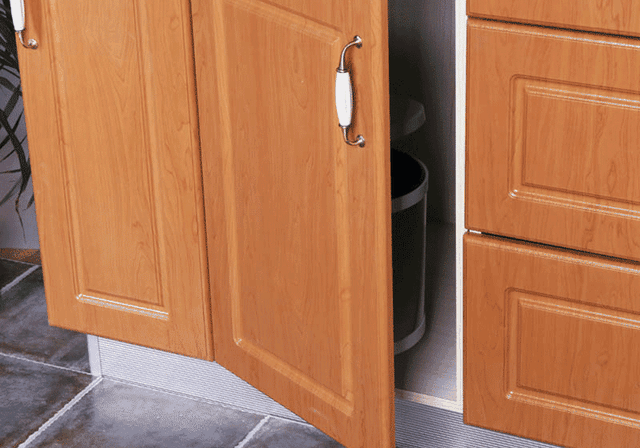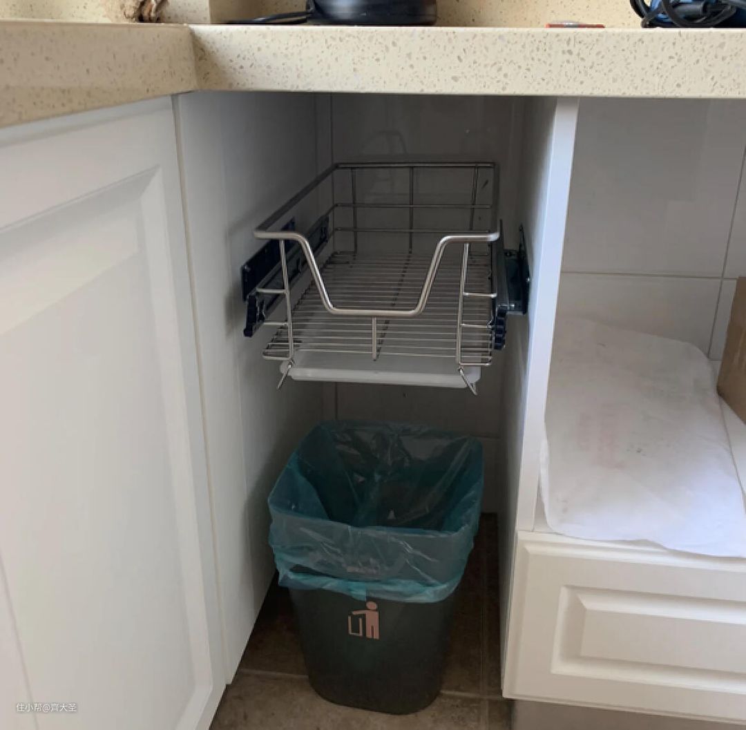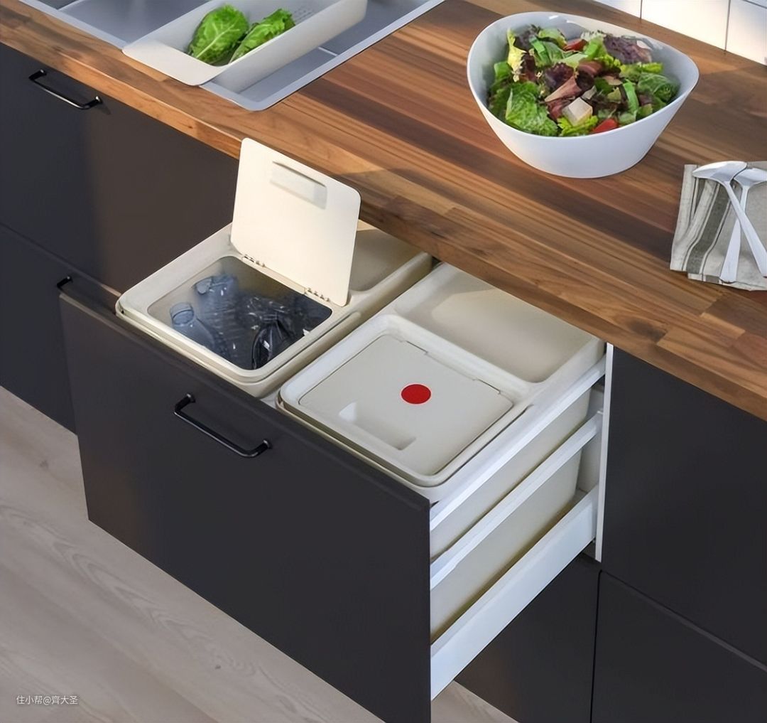 因为厨房的面积小,地板上放垃圾桶的话,会占用空间,绊手绊脚,很多人还会觉得影响美观。所以就有商家开发出了内嵌式垃圾桶,直接把垃圾桶内嵌在橱柜里面,用的时候拉出来。