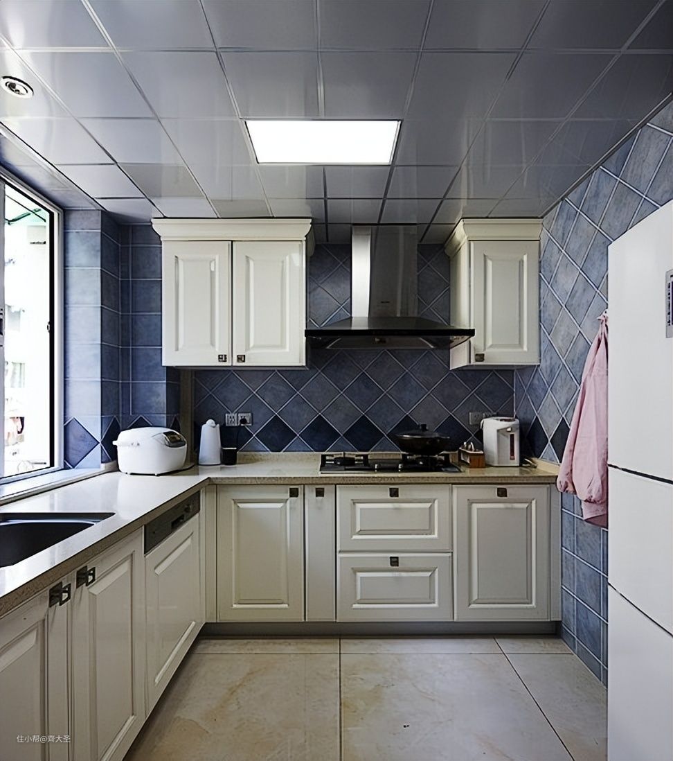 对于厨房来说还是选大尺寸的釉面砖更靠谱,卫生好打理,甚至墙面可以使用整面的珐琅板,一擦即净。