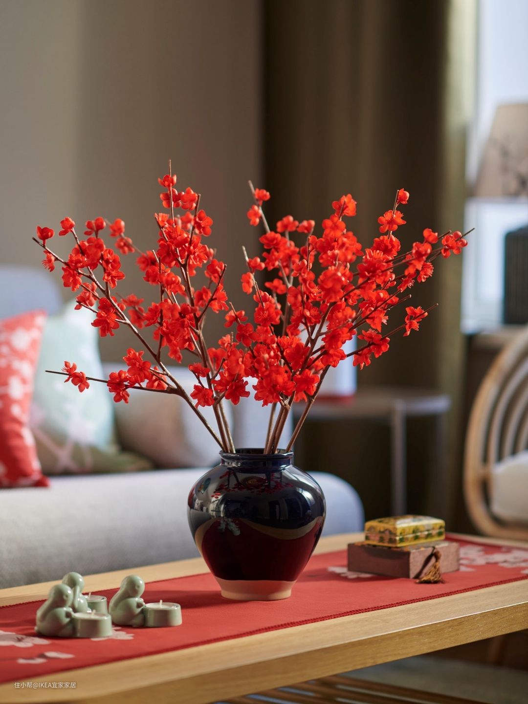 别具装饰性的长桌布,喜庆气氛呼之欲出。较短两侧饰有春日梅花图案,带来“传春报喜”的美好寓意。