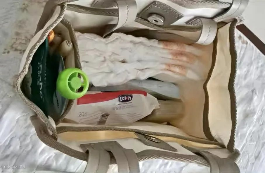 它本身是为带娃设计的,装尿不湿、纸抽、湿巾、小零食非常合适。
