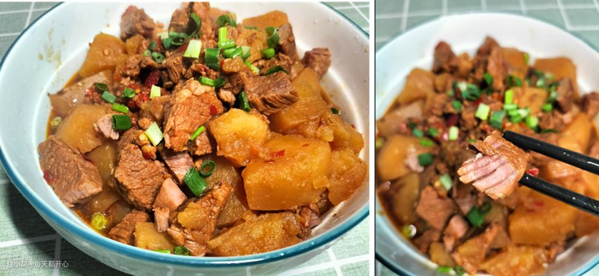撒上葱花出锅,咬一口给大家看看,外部看着还完整的牛肉块,实际已非常软烂,肉质丰厚,土豆更是入口即化。