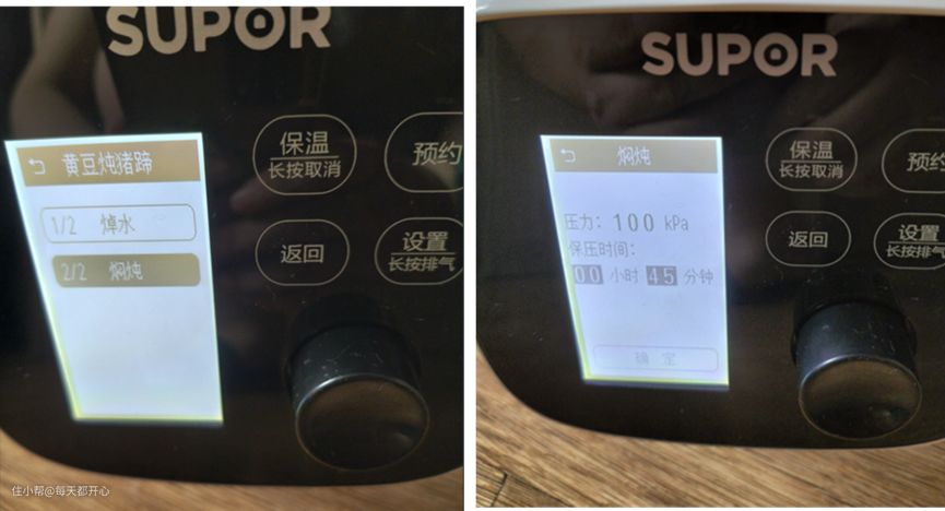 选择好“焖炖”,按设计的压力值100KPA和45分钟保压时间,按下旋钮确认。