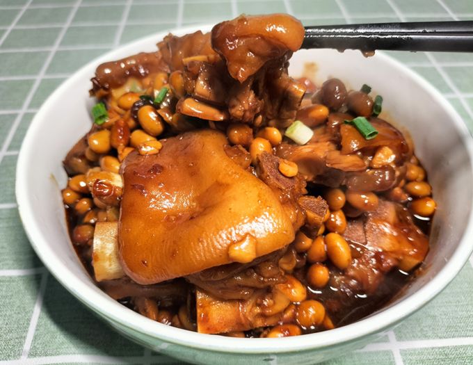 Q弹的猪蹄就跳跃在筷尖,咬一口软糯弹牙,滋味十足,黄豆更是葩软入味。