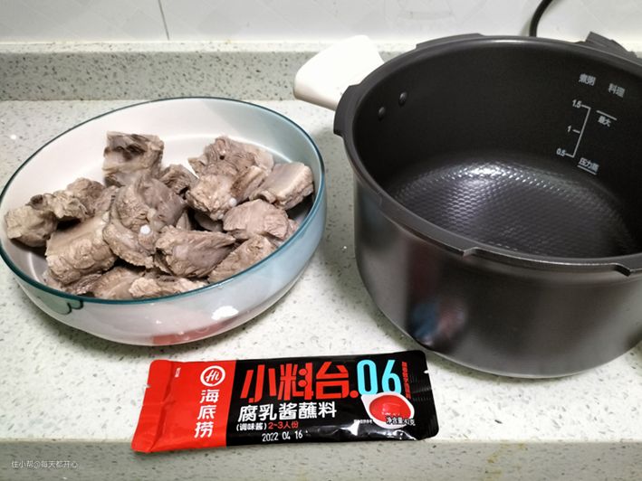 600克的排骨焯水,调料里面比较特殊的是需要南乳汁,这个不好买,我就买了海底捞的腐乳酱料来代替。