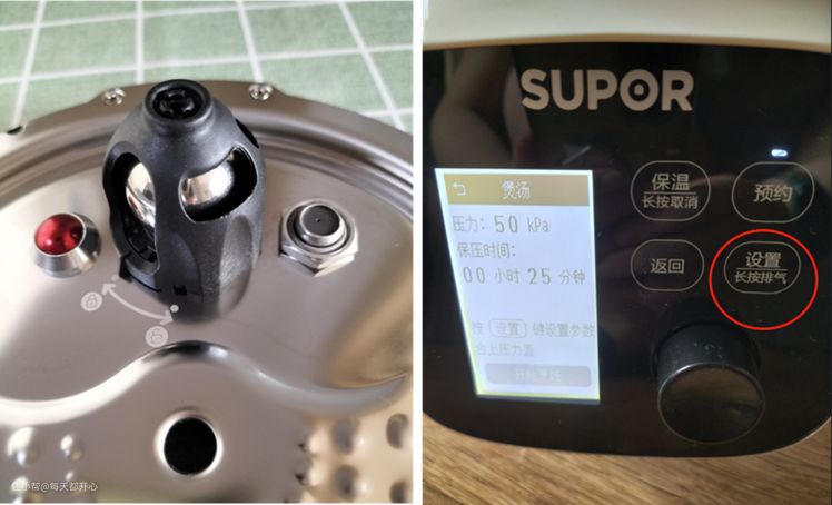 2、 排气的时候,会有一点点汤水从排气盖处溢出,要注意喷气口不能对着人