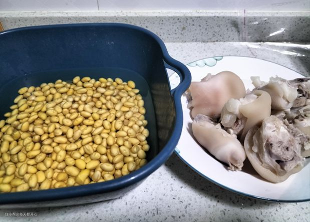 焯水后的猪蹄,加上黄豆,以及手机APP中提示的各款辅料。