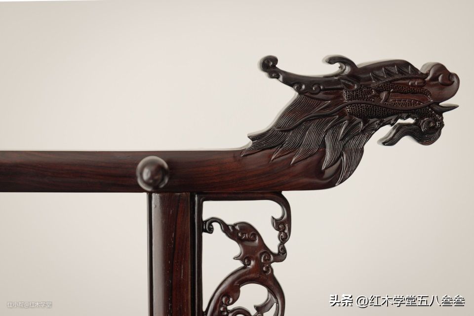 最上搭脑,两端出头,立柱圆雕龙头。衣架顶部搭脑横材与立柱相交的地方装透雕螭龙纹的挂牙,中牌子上下的横枨与立柱装透雕卷草纹的角牙。这样的红木榫卯衣架你们会喜欢吗?