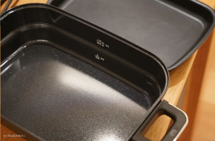 摩飞二代多功能锅的所有材料也都符合国家食品级标准,防烫手柄,加厚锅身,烤盘覆盖边缘防止汤汁滴落,都是值得夸的细节考虑,烤盘足足有四层,也明显感受到比老款厚实耐用。