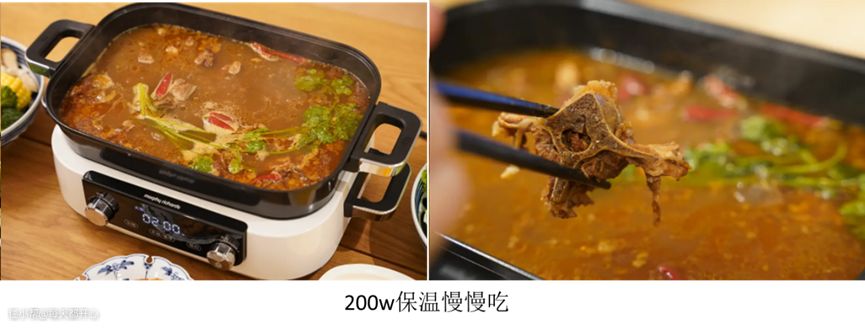 如果只是需要小火煨着或者保温,调到最低档200w即可,最低档也非常适合用来保温外卖,打包的羊蝎子、烤鱼或者烧烤,还有自己做好的菜,都可以放进摩飞里慢慢吃,冬天也不怕食物很快凉啦。