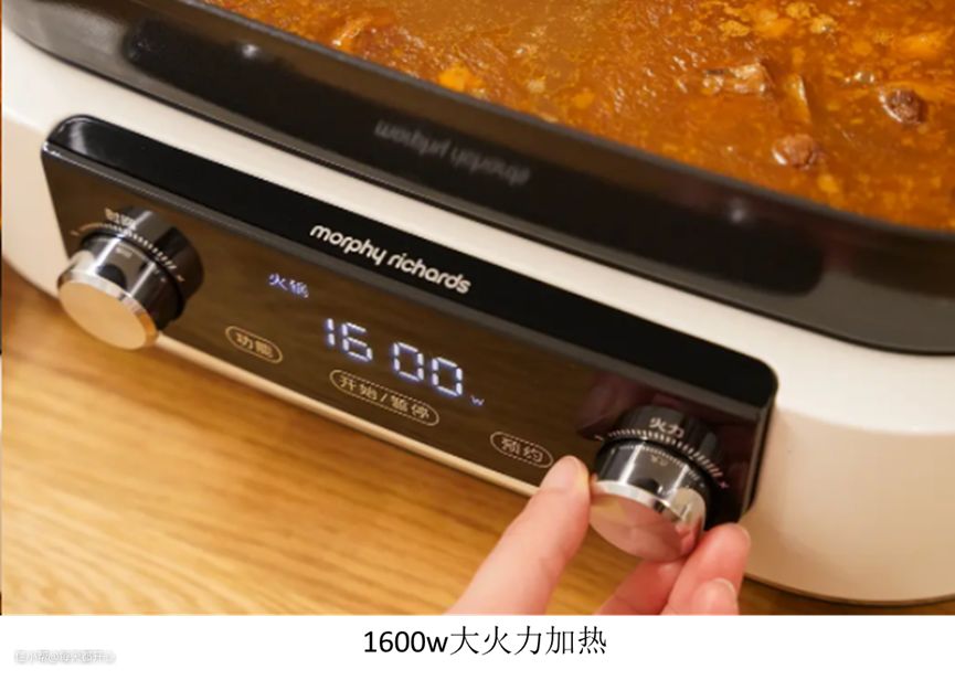 而摩飞二代从机械温控升级为智能电子温控,从200w到1600w,多档火候可以调节,恒定持续加热不会停(锅底有散风扇不会过热),需要大火煮开或者烧烤的时候调高,火力超足。