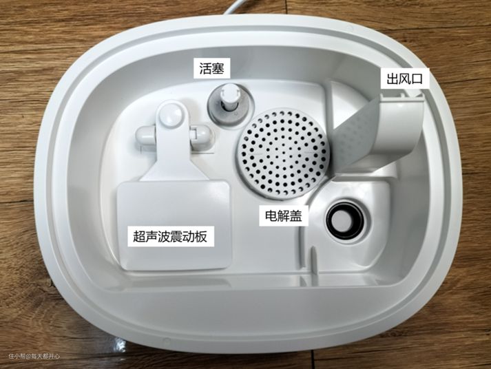 水箱放上去后,活塞就会打开,水经过滤芯,流到底座,经过电解后产生水雾,再通过导管喷出去。