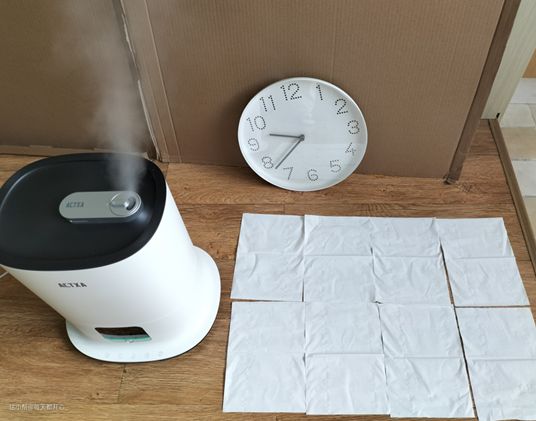 在地面铺上一层餐巾纸,打开阿卡驰加湿器的最大档,持续喷雾20分钟。