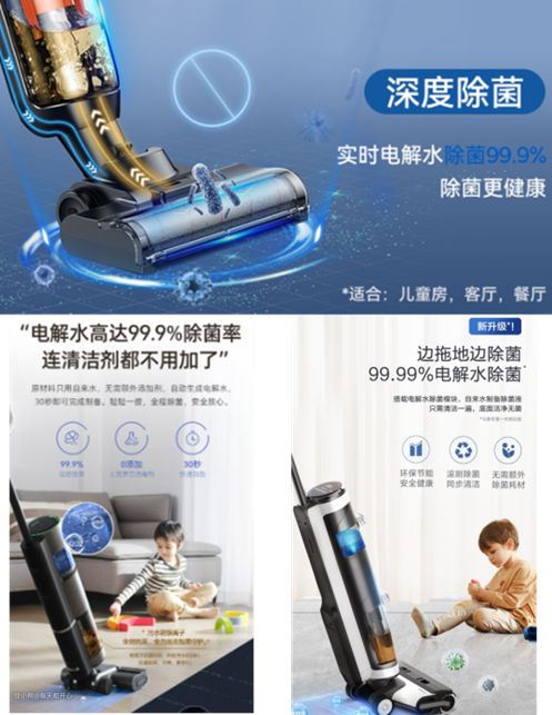 比如近年来风靡清洁圈的智能洗地机产品,知名的追觅的H12,添可的3.0,顺造的H200都采用了电解水除菌技术,产品详情页上标注得清清楚楚。