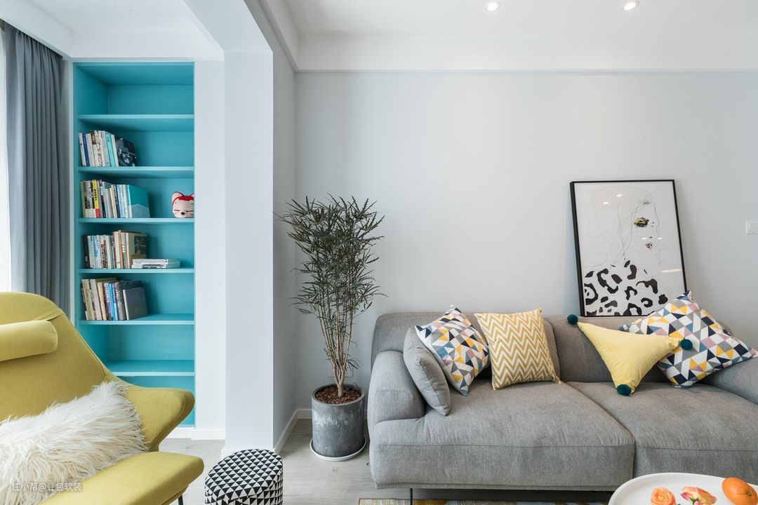 - 灰色的沙发搭配彩色的抱枕,沙发上趣味的装饰画,也增添客厅文艺清新感;