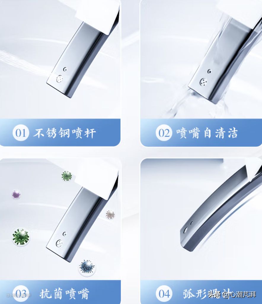 智能马桶的喷嘴使用时间长了难免会有水垢附在表面,而带有喷嘴自洁功能的会更加安全卫生。或是有可拆功能的喷嘴也会更加适合长久使用的打理。
