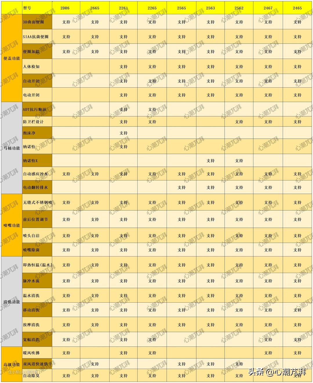 ▲TOTO智能一体机系列几款机器的功能参数详细对比