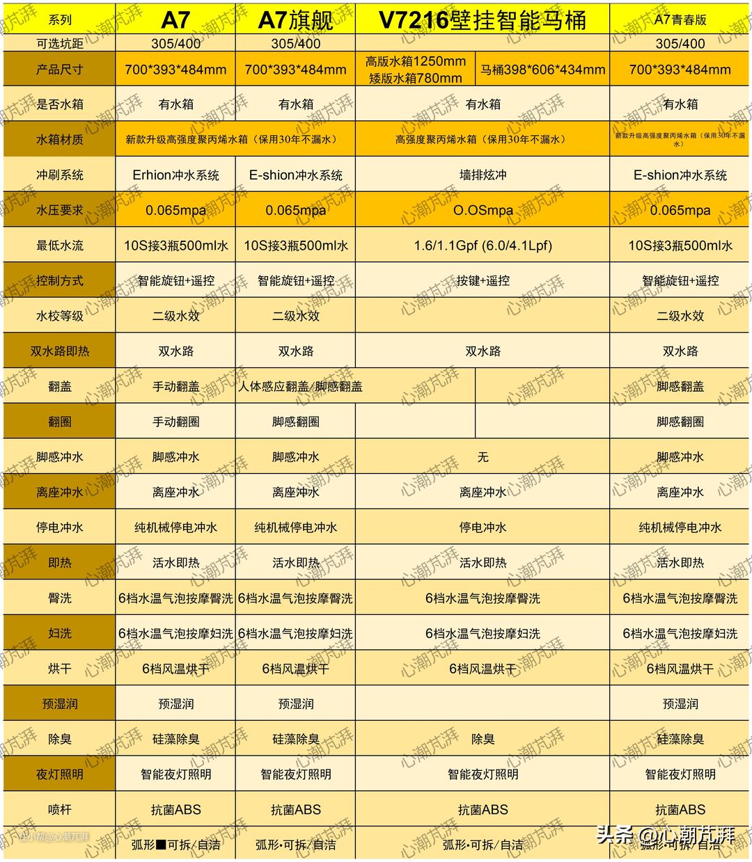 ▲同系列还有A7旗舰版和V7216壁挂式马桶。技能点差距如图表所示