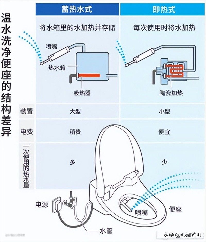 ▲即热式和储热式的两种智能马桶,最大的外观区别在于有无水箱。即热式马桶是没有水箱的,直接加热水管中流出来的活水。虽然这种加热方式对电压有一定的要求,极个别老旧小区的电压可能达不到标准,但在干净卫生方面却远超了储热式。储热式马桶是有水箱的,通过加热水箱中储存的水达到温水冲洗臀部的效果。弊端是水长期贮存在水箱当中,非常容易滋生细菌。