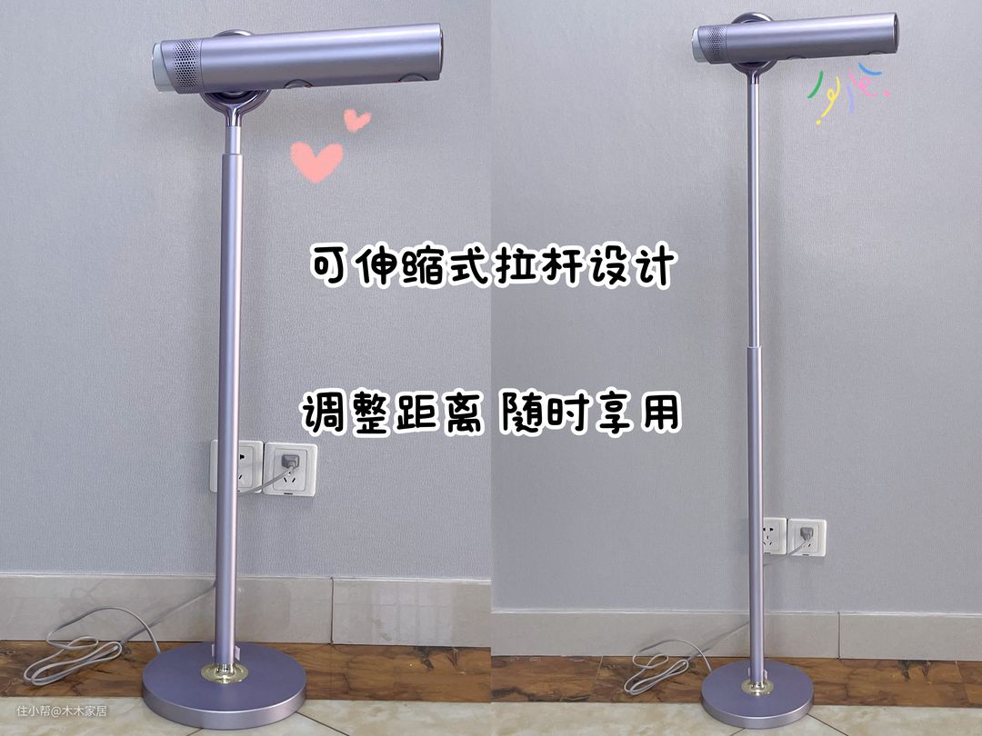 拆开包装之后,将底座和支架衔接上,安装完,给人的感觉特别像一个立式麦克风。不得不说品仕乐是懂审美的,以淡紫色为整体基调,一眼就戳中少女心。金属质感与时尚相结合,浪漫氛围灯衬托出家居满满仪式感,这下躺着,坐着就能吹干头发,彻底解决双手,简直是为女性量身打造的高级感吹风机!!!