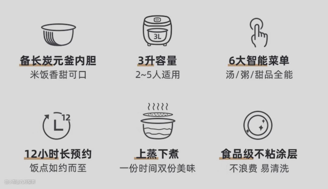 6大菜单功能,白米饭/柴火饭/甜品/煲粥/营养靓汤/蛋糕等,统统都不在话下,让你踏实成为“干饭人”!