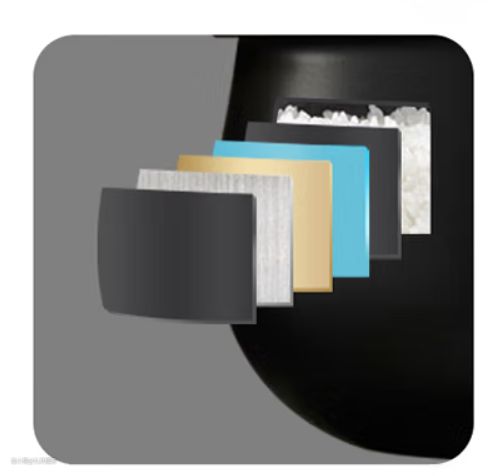 铝合金内胆(复合材料):因为铝导热均匀,成型容易,还可以与其他金属或合金复合,所以目前市面绝大多数都是这类材质。但是铝制用品一般用来盛放酸、咸等食物时容易析出对人体有害物质,所以一般内胆都会有涂层,用来隔绝食物和铝合金的直接接触。比如陶晶、黄晶、黑晶、彩晶等都属于这类。