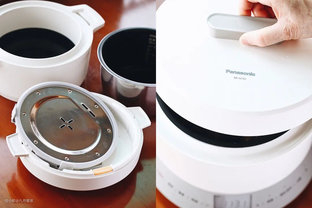 我尤其喜欢这台电饭煲的盖子。设计简洁,可以整个取下来,一键拆开内盖,清洗就不会留死角,比盖子拿不下来的电饭煲卫生多了。