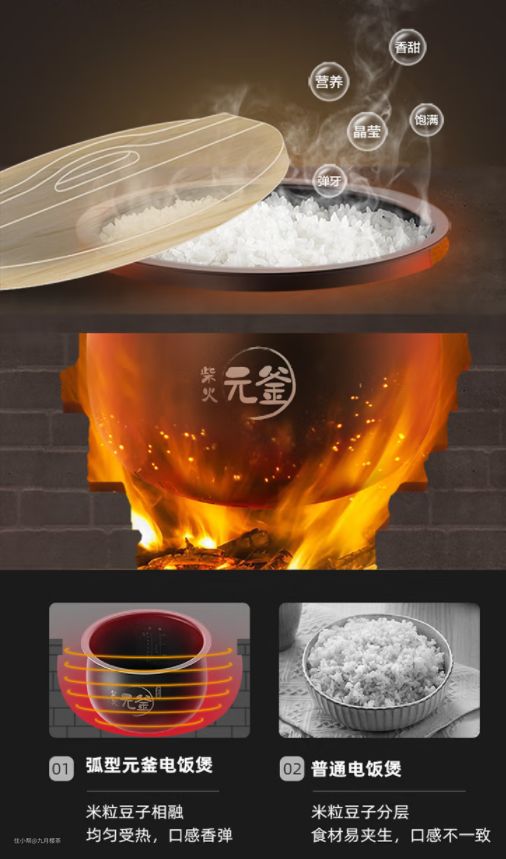 它通过模拟柴火土灶的煮饭状态,加上800W大火力,形成了环流大沸腾,让米粒在锅里尽情翻滚,每一粒米都能喝饱水。