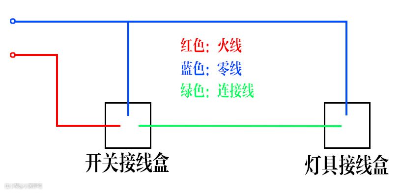 首先我们来了解一下普通开关的布线:从配电箱里引出一根火线,接到开关接线盒里。再引出一根零线,接到灯具接线盒里。最后拿一根线,连接灯具接线盒和开关接线盒,示意图如下▽