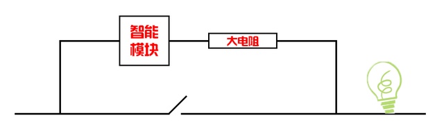 开关断开时,为了不让智能模块断电,就要把它和开关并联。又为了防止断开开关后灯具发光,又给智能模块串联了一个大电阻,来降低电路中的电流。