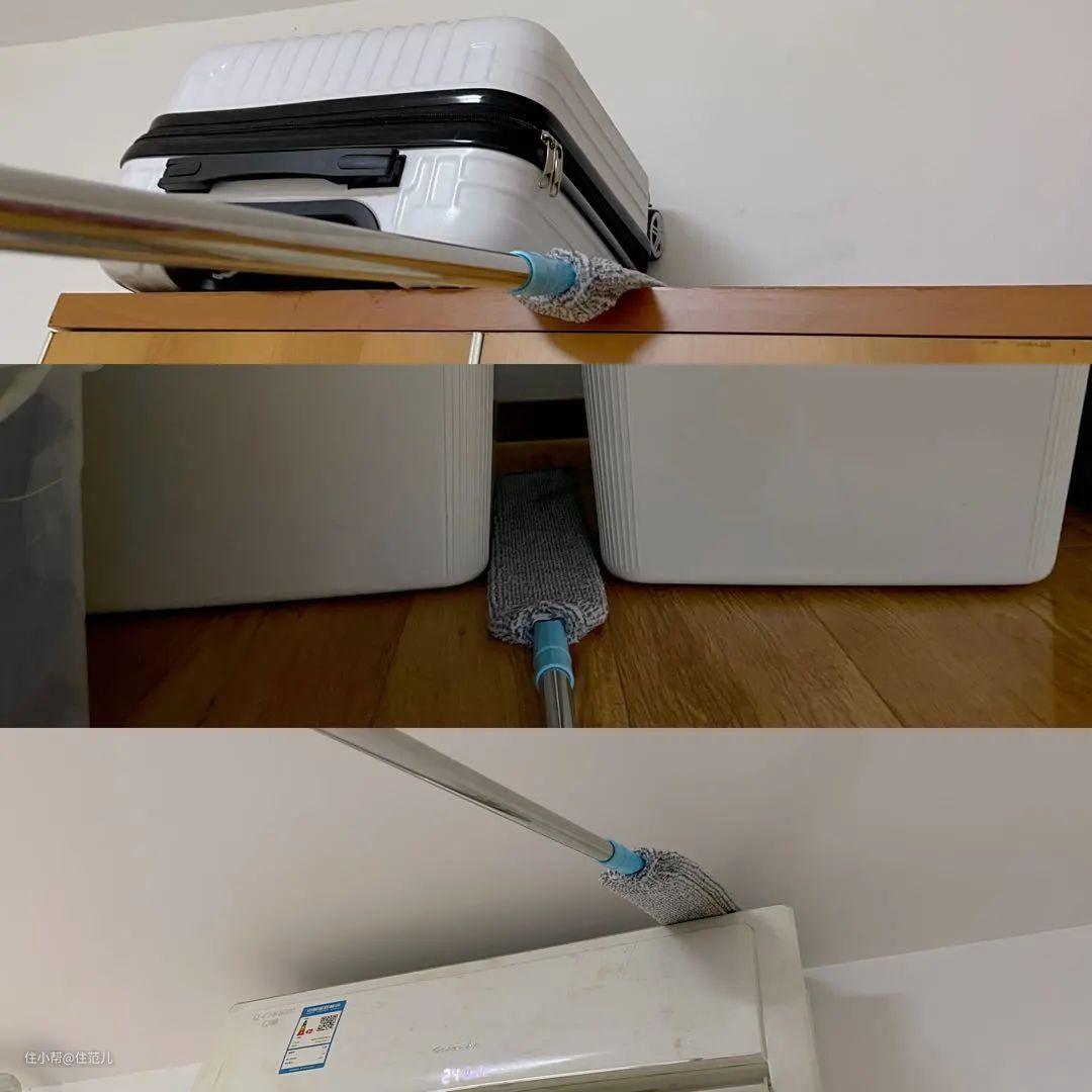 它是可伸缩的,总长156㎝,柜顶、床底、空调顶部等清洁死角都能够得着。