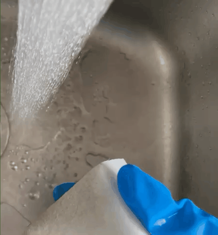 直接把五洁粉撒在水槽周围,用沾一点水的抹布擦拭,可以看到锈迹、水渍、霉斑都擦掉了。