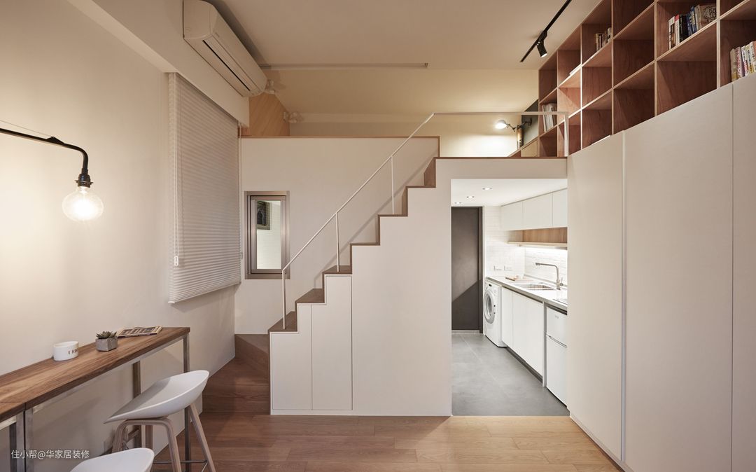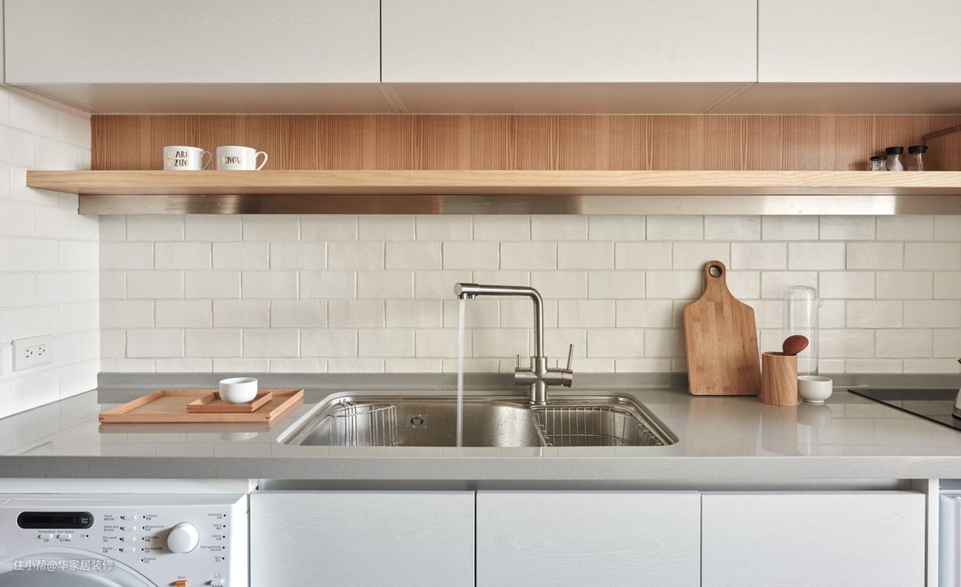 - 下面地柜做抬高处理,提前预留位置,两侧一边放洗衣机,一边放小冰箱,一人居住标配;