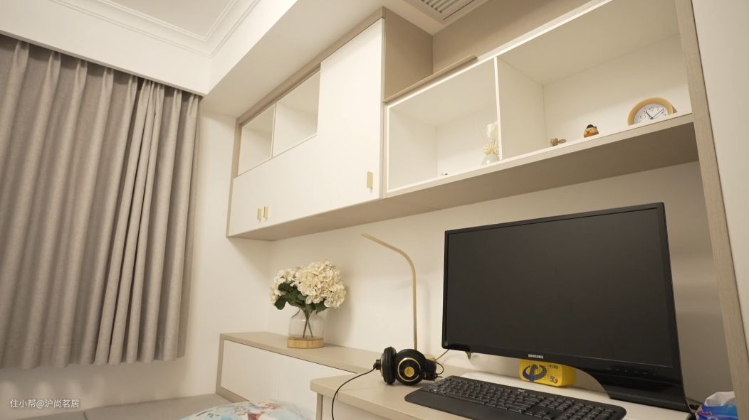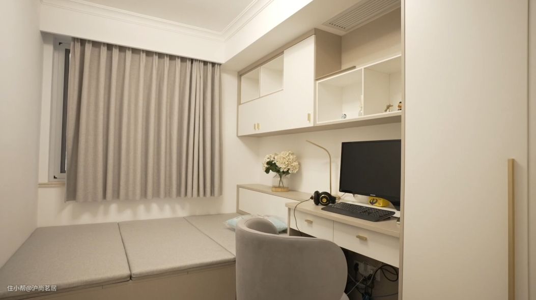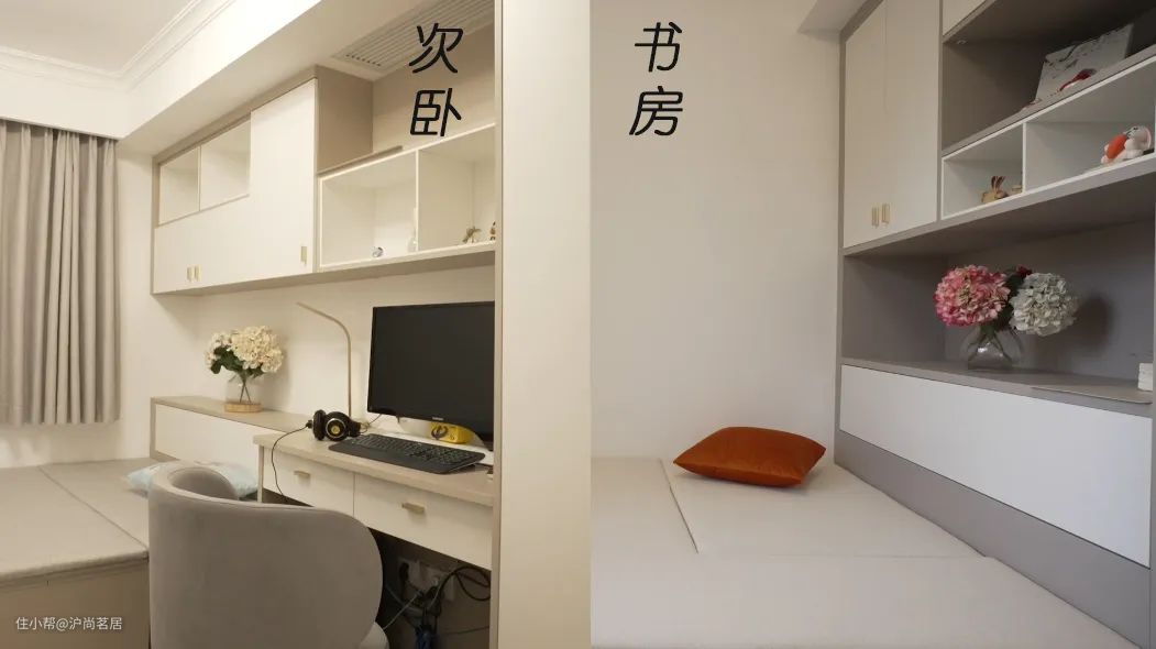 朝北的书房,装修中重新布置了一下,和次卧的设计思路差不多,房间的面积都不是很大,采用了定制柜+榻榻米的设计,节省空间的同时还能增强储物功能。