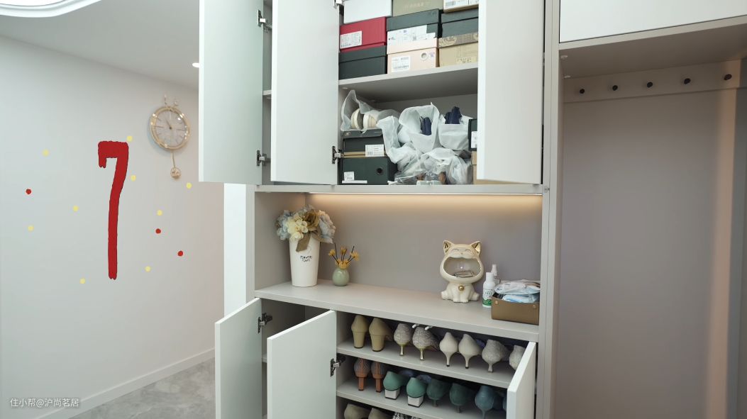 1、新建玄关柜,打造进门换鞋、收纳空间,增强入户仪式感,避免一览无余;
