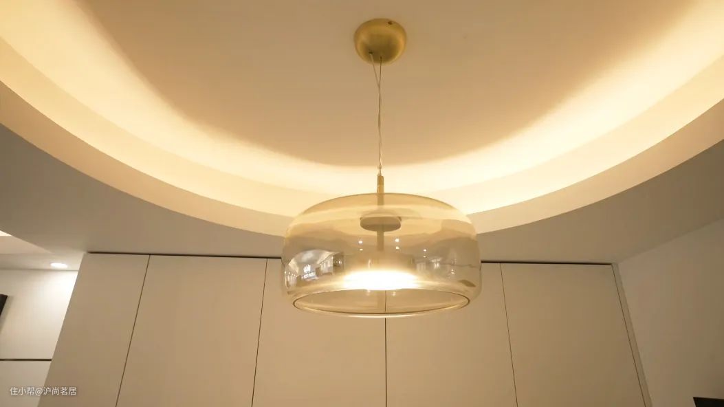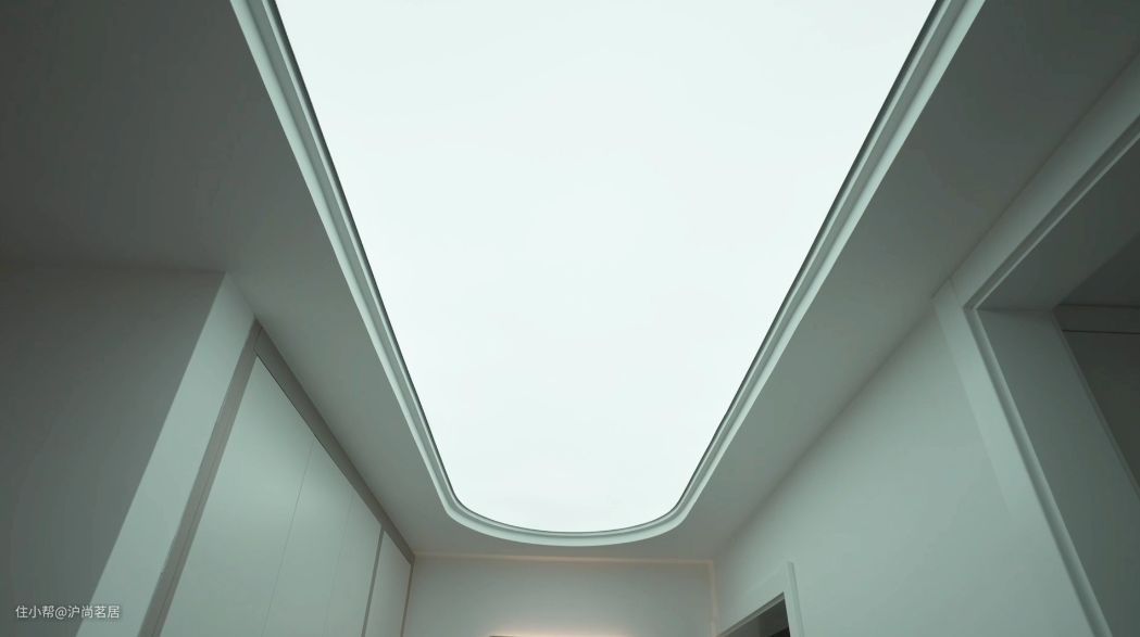 玄关处还有一个设计亮点——软膜天花板。玄关处多了一堵玄关墙,把原本南向阳台可以带进来的采光阻隔掉,而这套房子在装了中央空调、地暖和吊顶之后,层高也受到影响,做这样的软膜天花板,不仅能让空间变得明亮很多,上下层高的空间感也会好很多。